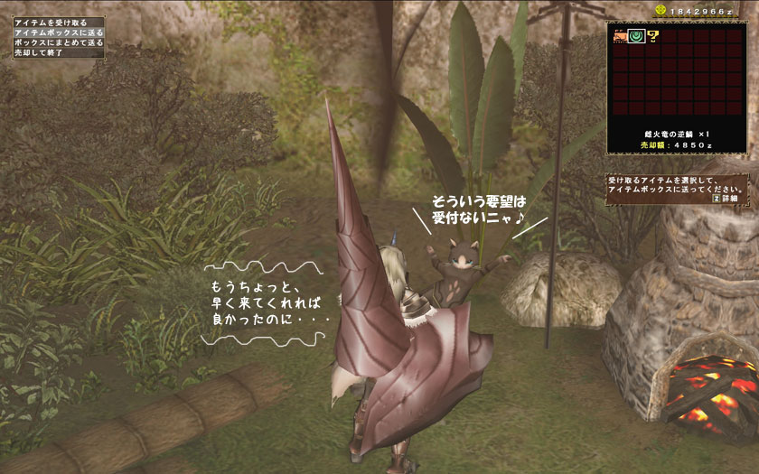 んで、、、、、前回から「雌火竜の逆鱗」を求めて、樹海レイアの尻尾斬りを1日5回、