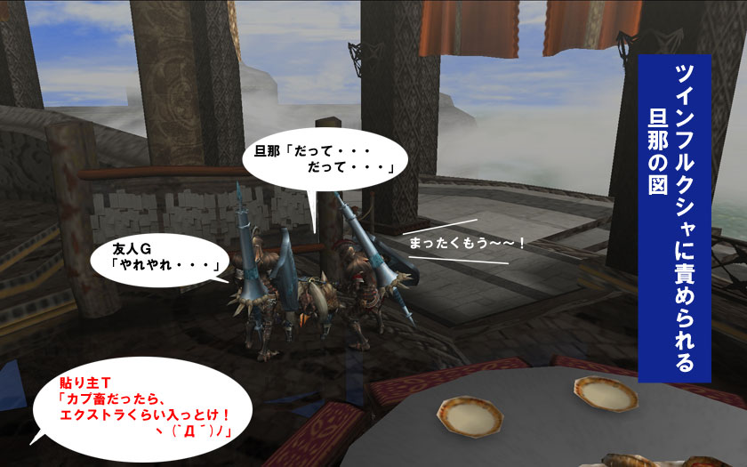 ↑クエから帰ってきたら、お留守番係りしてた旦那の小芝居が始まりました・・・orz