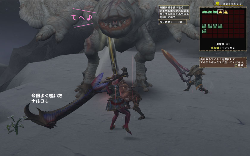 あっさりと「このクエはモノブロスハート、出るねえ^^」と言ってきた。